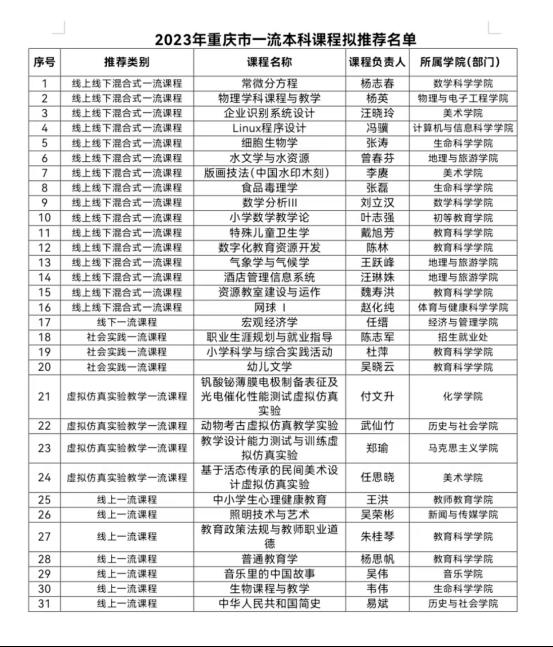 ※2023年9月18日,学校教务处公布2023年重庆市一流本科课程拟推荐名单,我院教师汪晓玲的《企业识别系统设计》、李赓的《版画技法(中国水印木刻)》、任思晓的《基于活态传承的民间美术设计虚拟仿真实验》榜上有名。