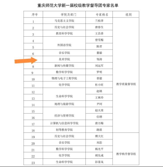 3月11日,学校教务处公布新一届校级教学督导团专家名单,我院邹涛教授入列,获聘教学质量督导组专家。3月25日,新一届美术学院教学督导团专家名单公布,周学初、冯维波、周福英、倪纯如四位老师获聘。