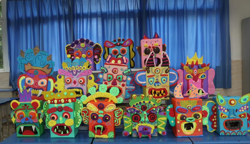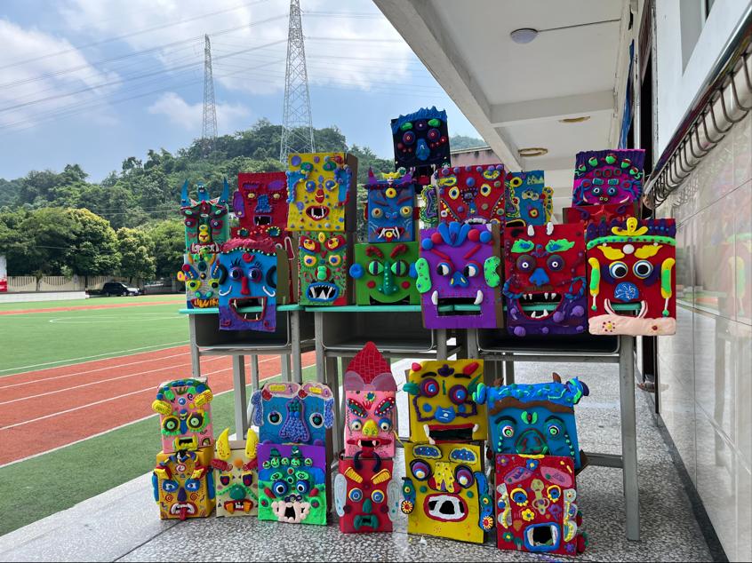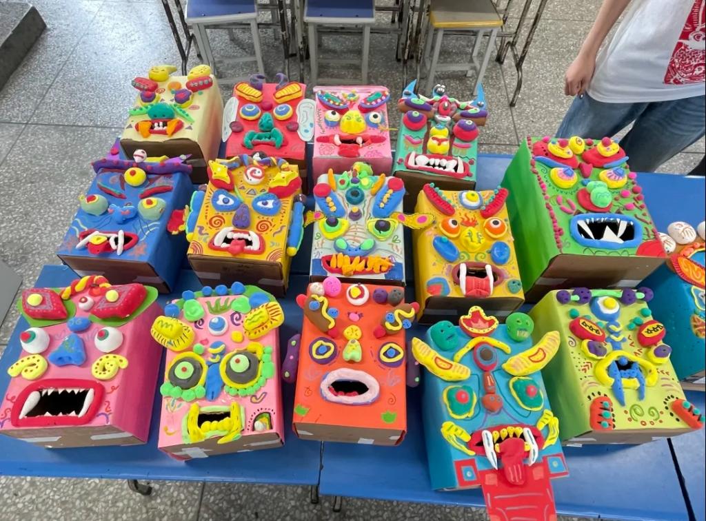 下午,第一堂课《吞口面具》开讲了。这堂课以非遗吞口为主线,让学生通过丰富的非遗吞口文化,了解吞口的历史与来源并进行了动手设计和实践。用粘土、卡纸、马克笔材料制作吞口综合材料作品,感受吞口的五官特征和纹样的丰富性,在绘画和泥塑中感受非遗面具带来的独特魅力,同时以小组合作的形式展开,同学们互相帮助,其乐融融。