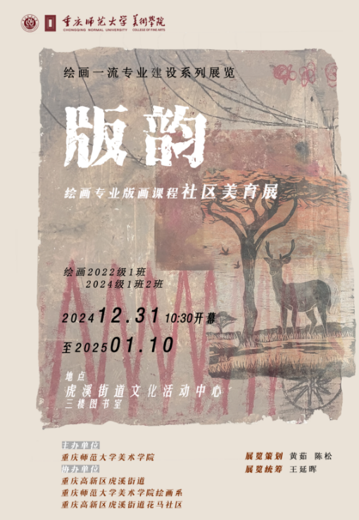 12月30号上午,由美术学院主办、绘画系承办的“版韵-绘画专业版画课程社区美育展”在虎溪街道文化活动中心开幕,本次展览是绘画一流专业建设系列展览之一,也是学院与社区联合的一次尝试。它不仅展示了课堂的教学成果,也让艺术走近大众生活,为社区文化注入了新的活力。
