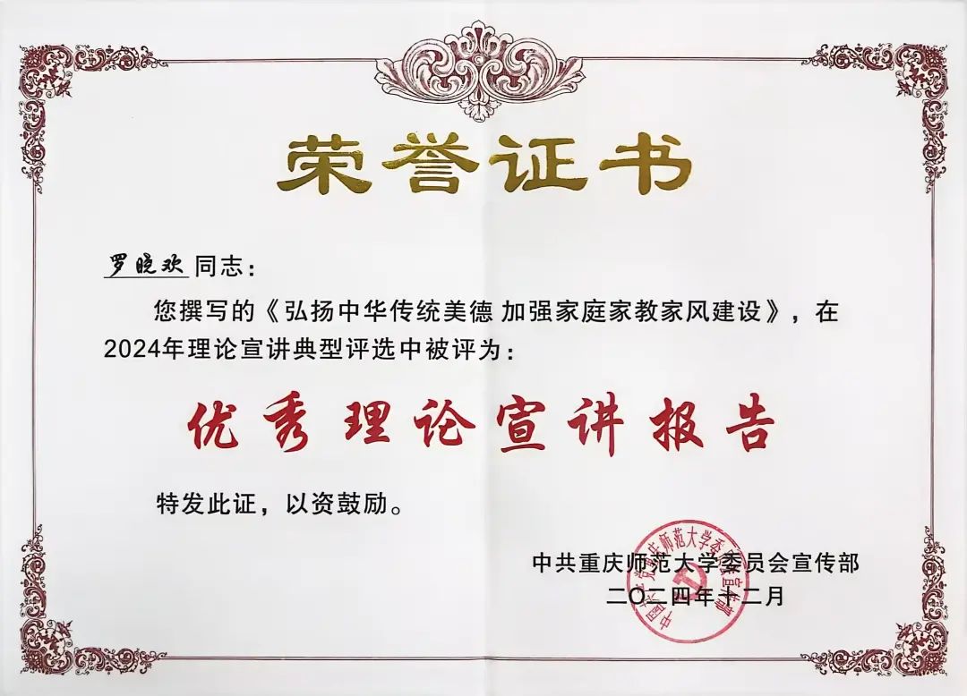 美术学院院长罗晓欢教授的论文《弘扬中华传统美德 加强家庭家教家风建设》获校党委宣传部颁发的“优秀理论宣讲报告”奖。